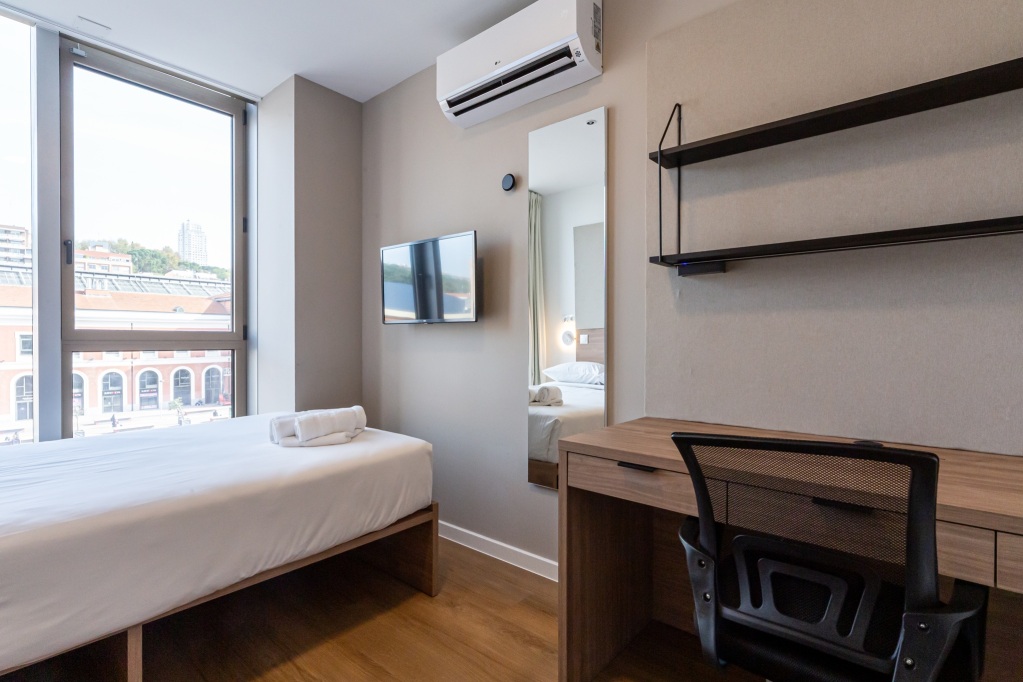 Each bedroom includes a comfortable single bed that ensures maximum comfort and restful sleep, a study desk with an ergonomic chair, a wardrobe with shelves, and ample storage space. Additionally, all bedrooms are equipped with air conditioning and receive plenty of natural light, creating a bright and inviting atmosphere. Fresh bed linens and towels are provided to ensure a pleasant stay from day one.