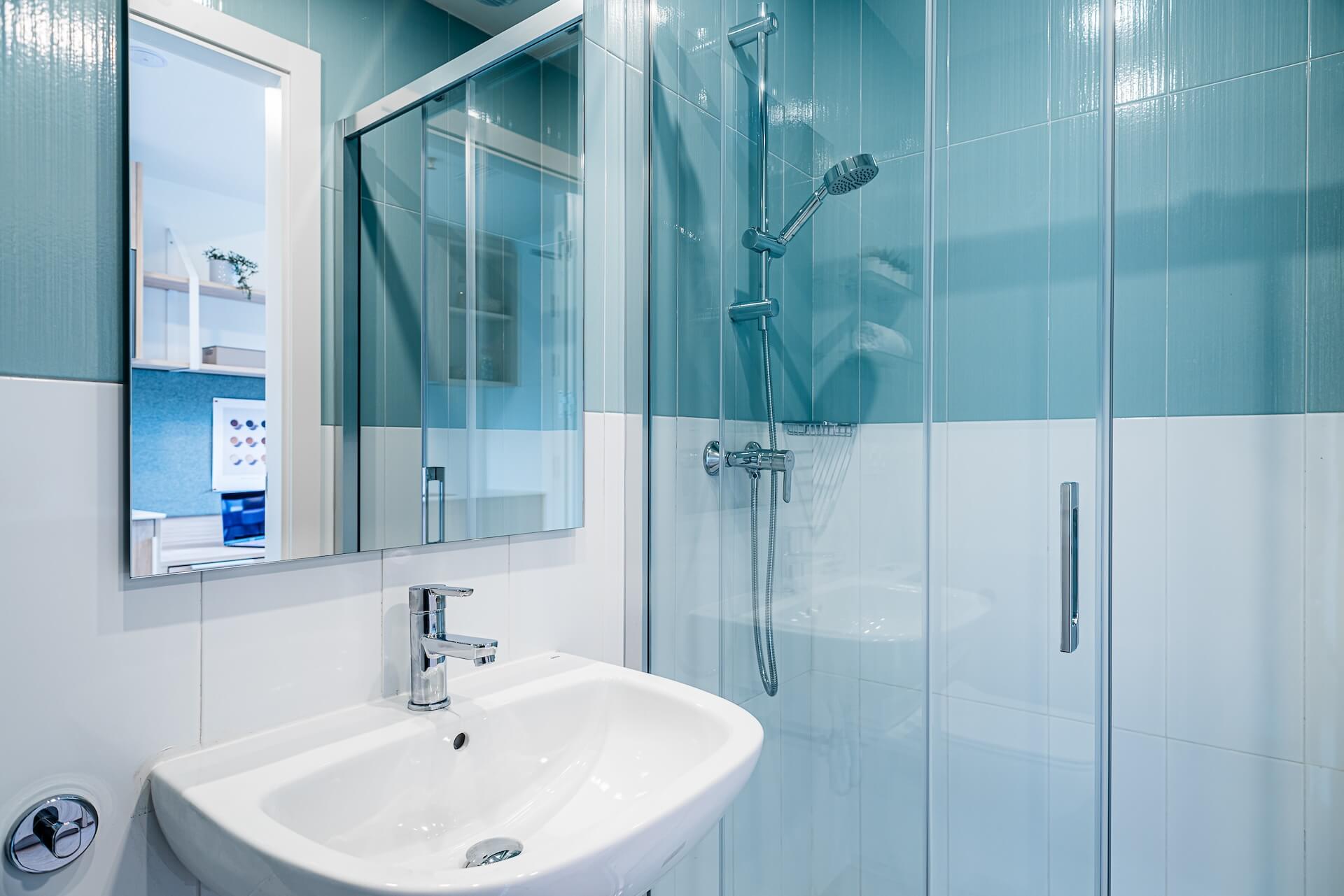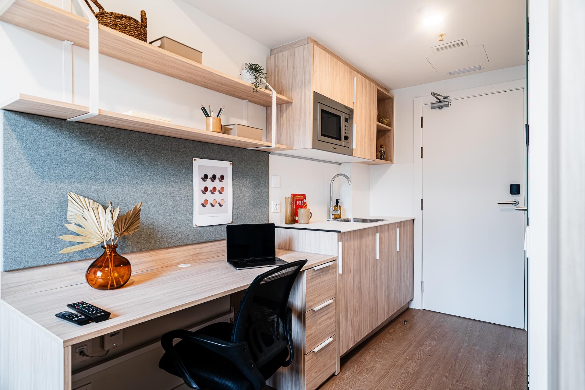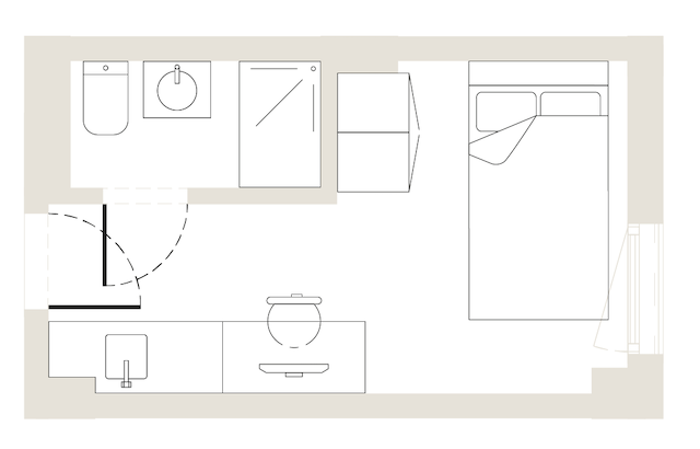 Our Classic Ensuites are located on the first, second, third & fourth floors and are 13m2. They are designed so you have the privacy of your own bedroom and ensuite bathroom while still enjoying the buzzing atmosphere of a shared living room and kitchen with 6 to 7 other people. Each ensuite comes with a compact double bed, study desk & chair, wardrobe with shelving, full length mirror and ensuite bathroom.