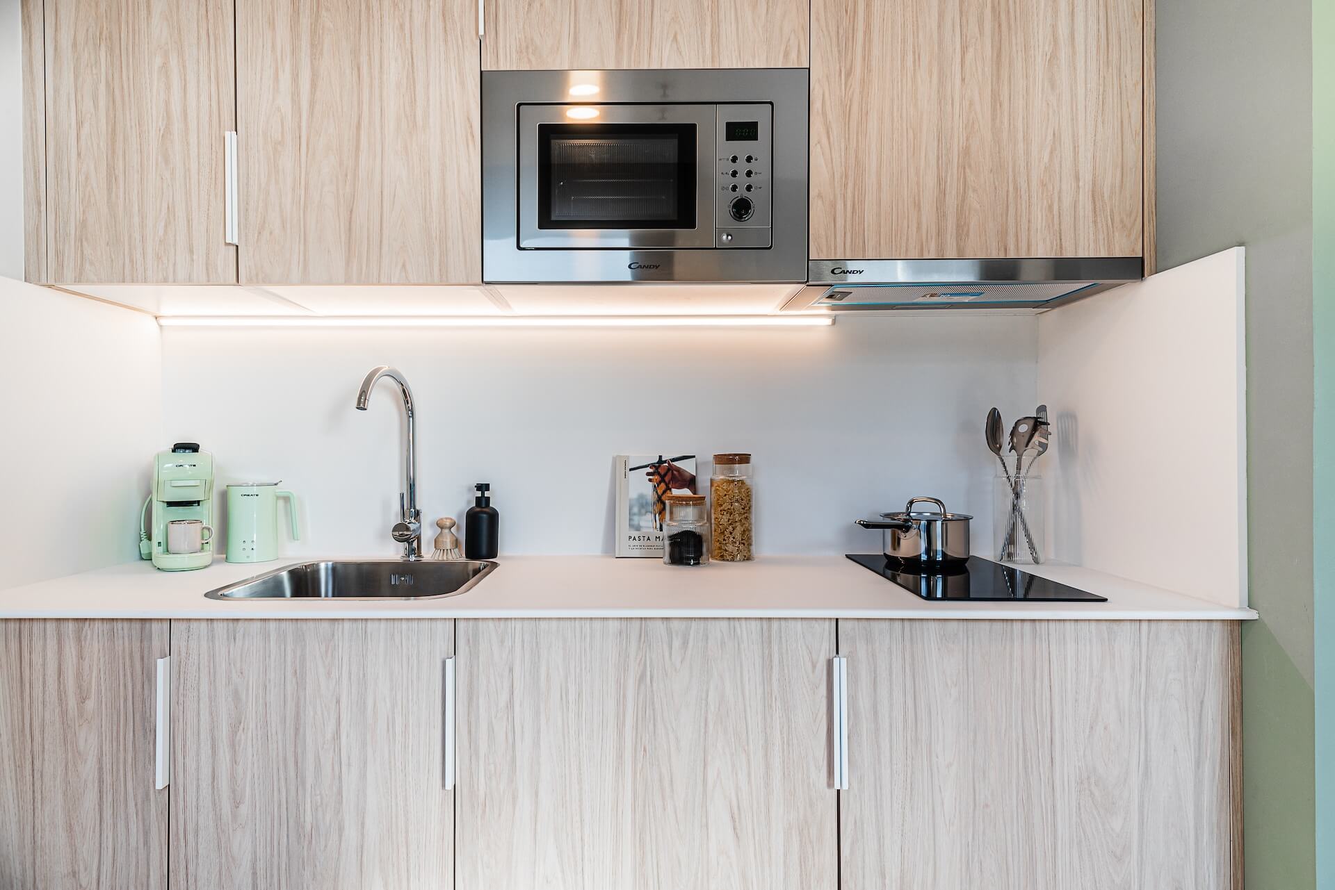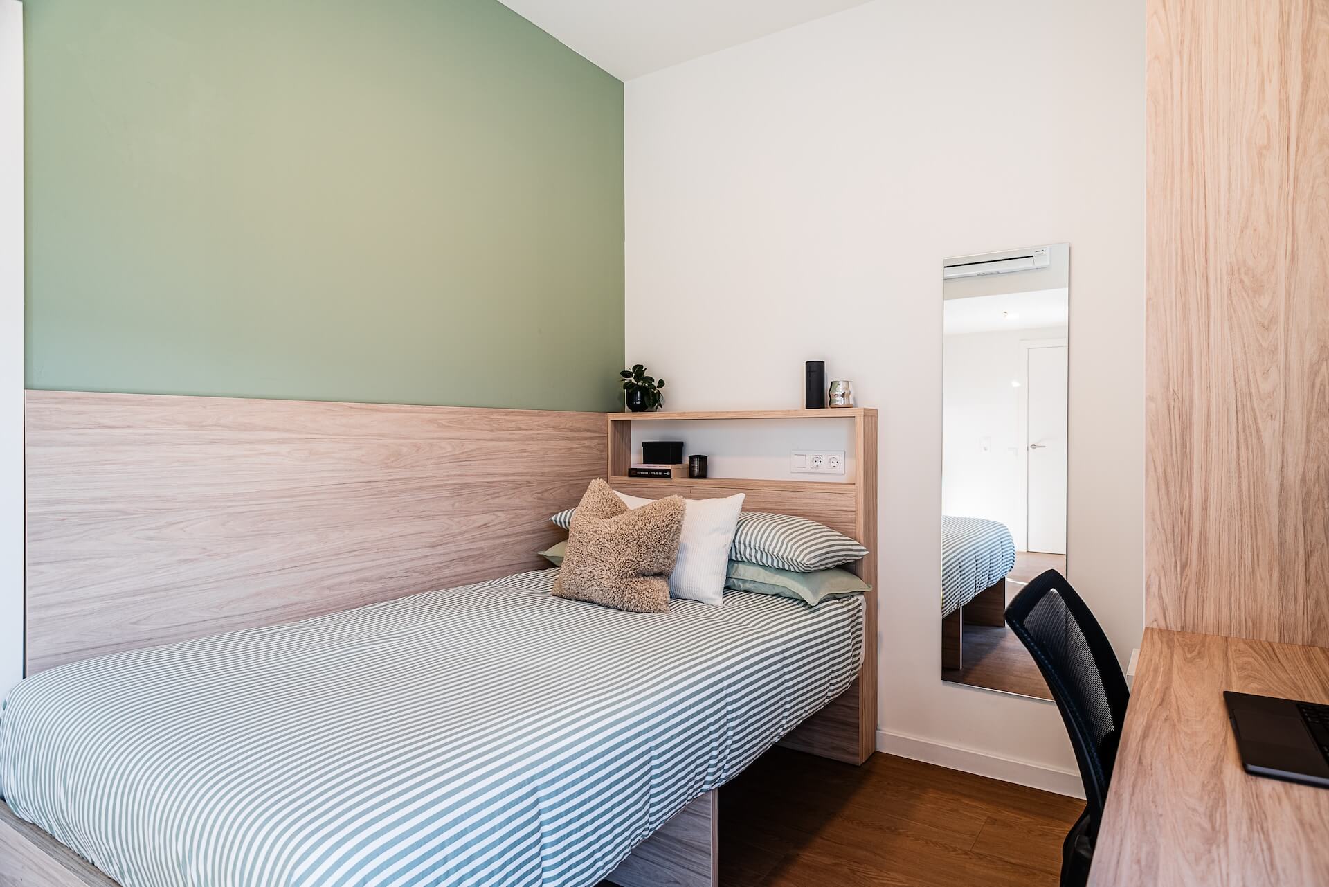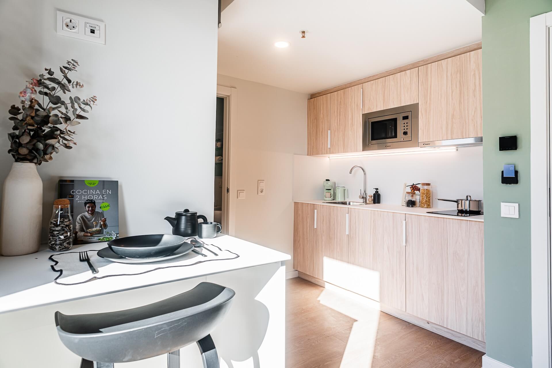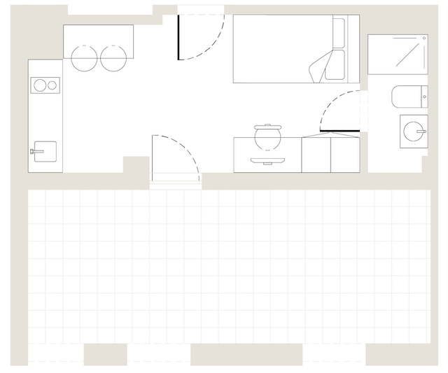 Our Superior Studios with Terrace are penthouse studio with large terrace, 16-23m2 and located on the fifth floor. Each studio apartment comes with a compact double bed, study desk & chair, wardrobe with shelving, full length mirror, ensuite bathroom and a kitchenette with storage, induction hob, combi microwave oven & fridge.