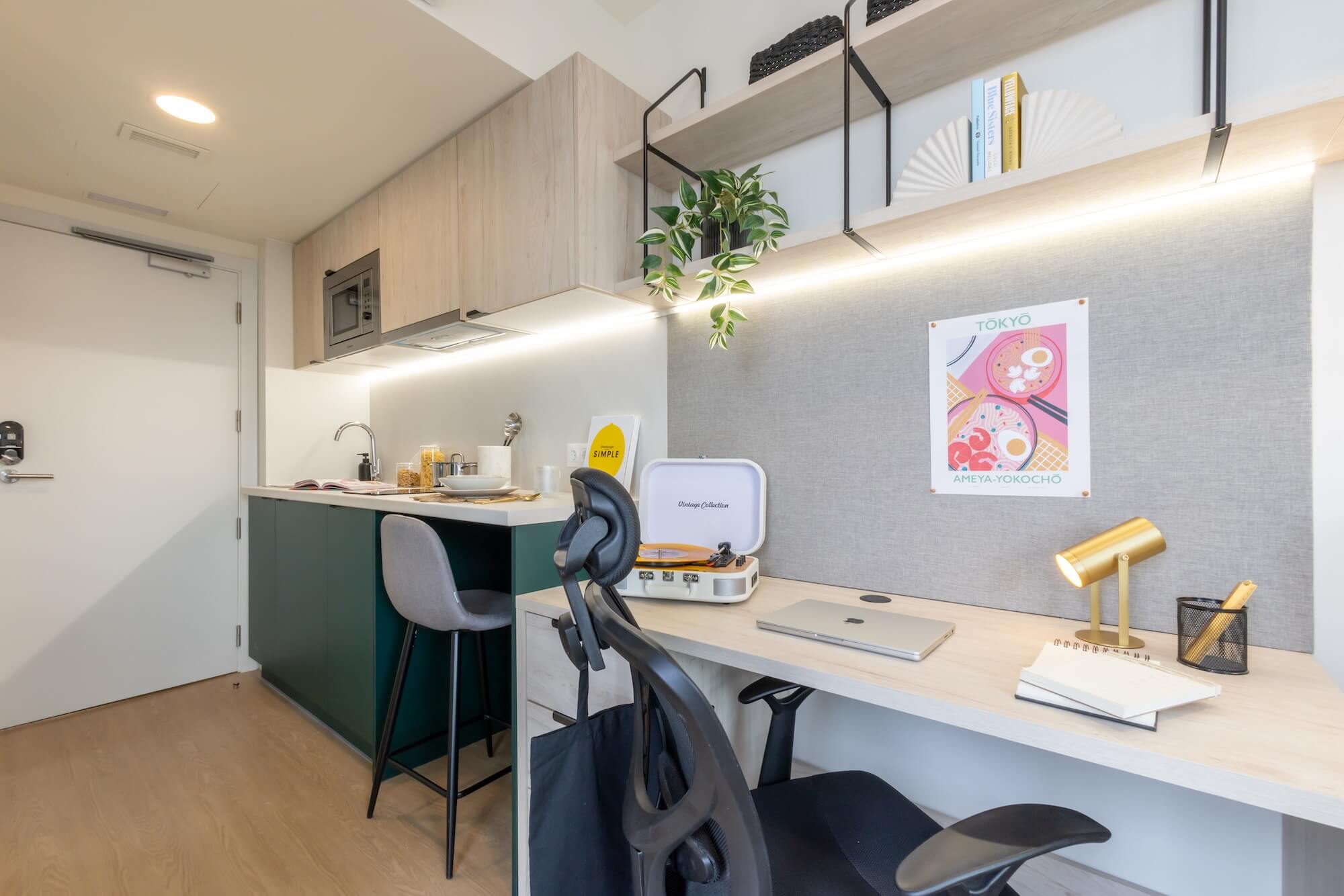 Our Premium Studio with Terrace is perfect for those who value extra space both inside and out. These 14-15m2 studios, located on the top floors, come with terraces ranging from 8-20m2. You’ll enjoy a kitchenette with a 2-ring induction hob, cooker hood, sink, a fridge with freezer compartment, and a microwave combi-oven. Inside, you’ll find a comfy 120cm bed, smart TV, spacious wardrobe, study desk with LED task lighting and an office chair, and a private ensuite bathroom.