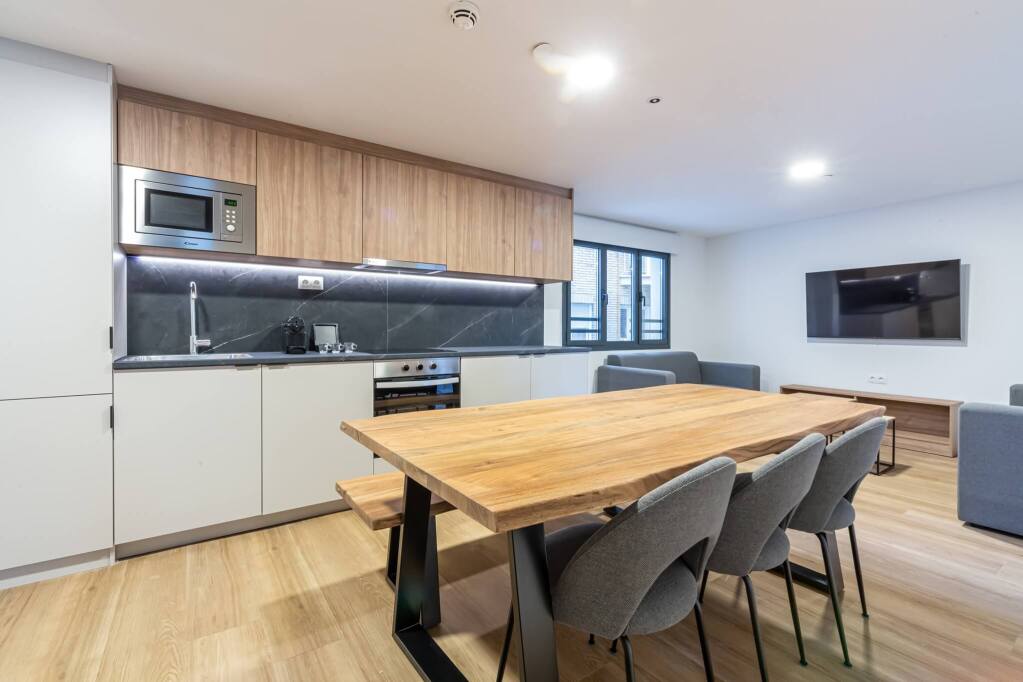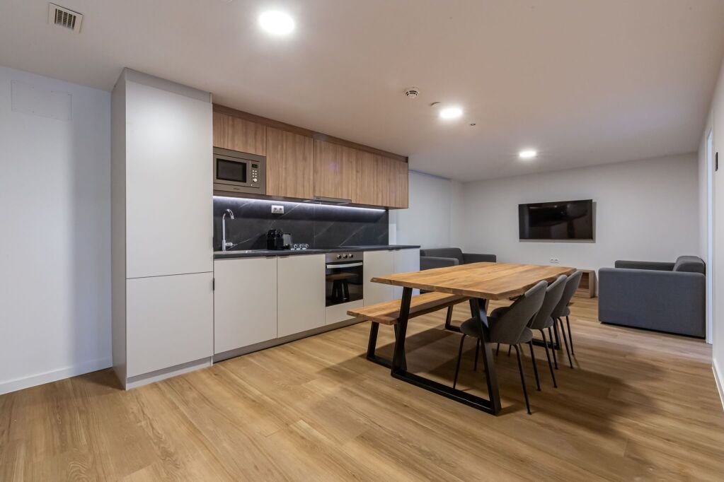 The design of the spaces is thoughtful and modern, creating an environment that encourages social interaction and enjoyment while combining functionality and style in every detail. Our Three Bedroom Apartments provide the perfect setting for shared stays in Madrid, balancing private living spaces with a cozy communal area for creating memories together.