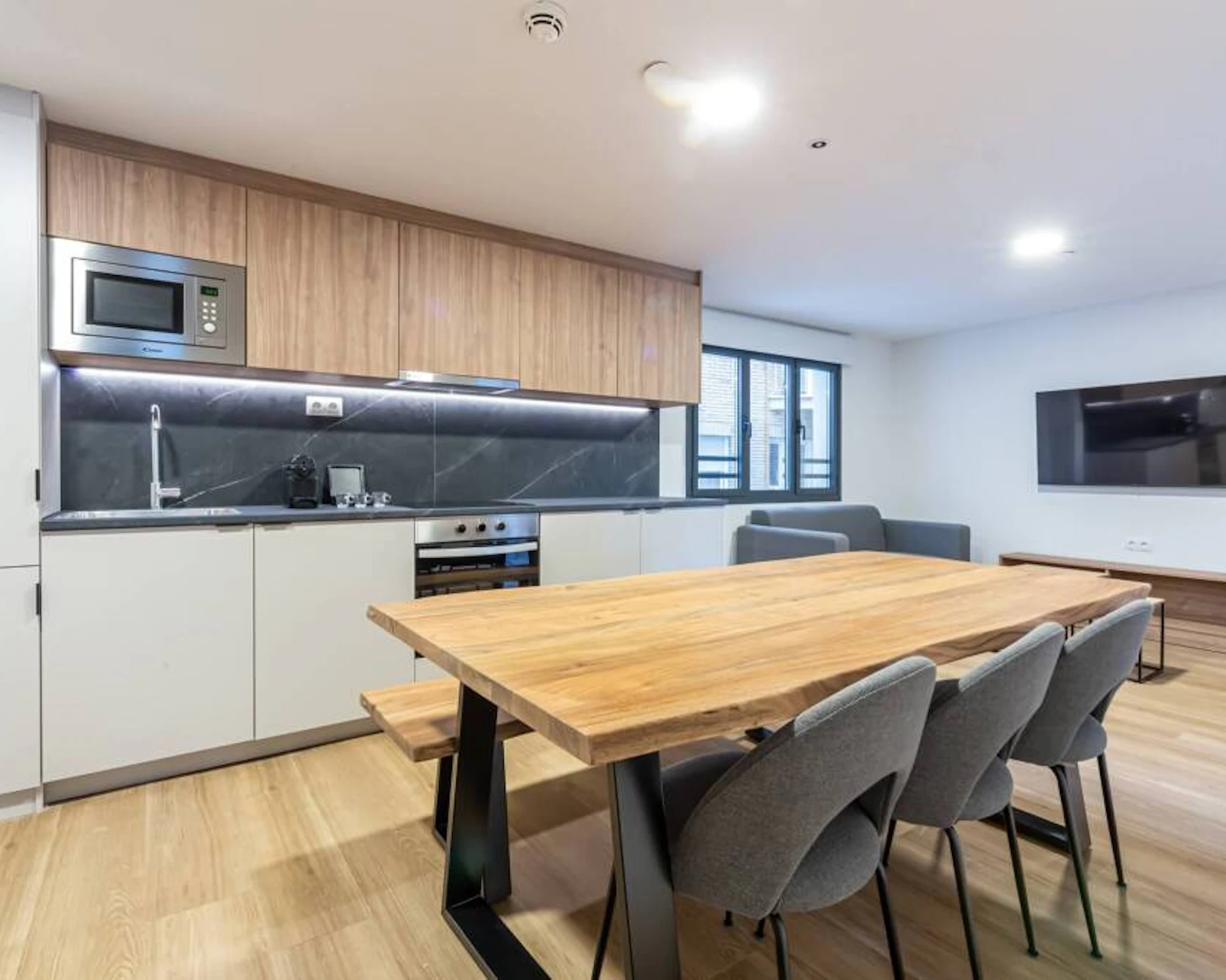 The shared kitchen and living room are the heart of the apartment. This area includes two comfortable sofas and a large smart TV, perfect for relaxing or enjoying group entertainment. The fully equipped kitchen features an induction hob, oven, microwave, sink, fridge, and a Nespresso machine so you can enjoy a coffee anytime. It also offers plenty of storage space to keep everything organized and within reach. The communal dining table, crafted from wood and designed with style, is perfect for meals, gatherings, or casual conversations. While kitchenware is not provided, you have the flexibility to organize your meals and drinks as you like. This area also has dedicated air conditioning to ensure everyone's comfort.