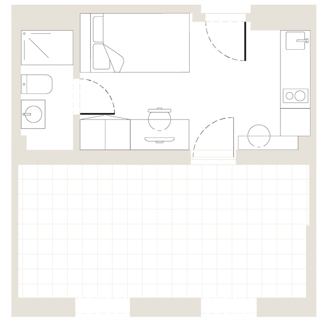 Our Premium Studios with Terrace are a penthouse studio with large terrace (15m2 plus), 13.5-14.5m2 and located on the fifth floor. Each studio apartment comes with a compact double bed, study desk & chair, wardrobe with shelving, full length mirror, ensuite bathroom and a kitchenette with storage, induction hob, combi microwave oven & fridge.