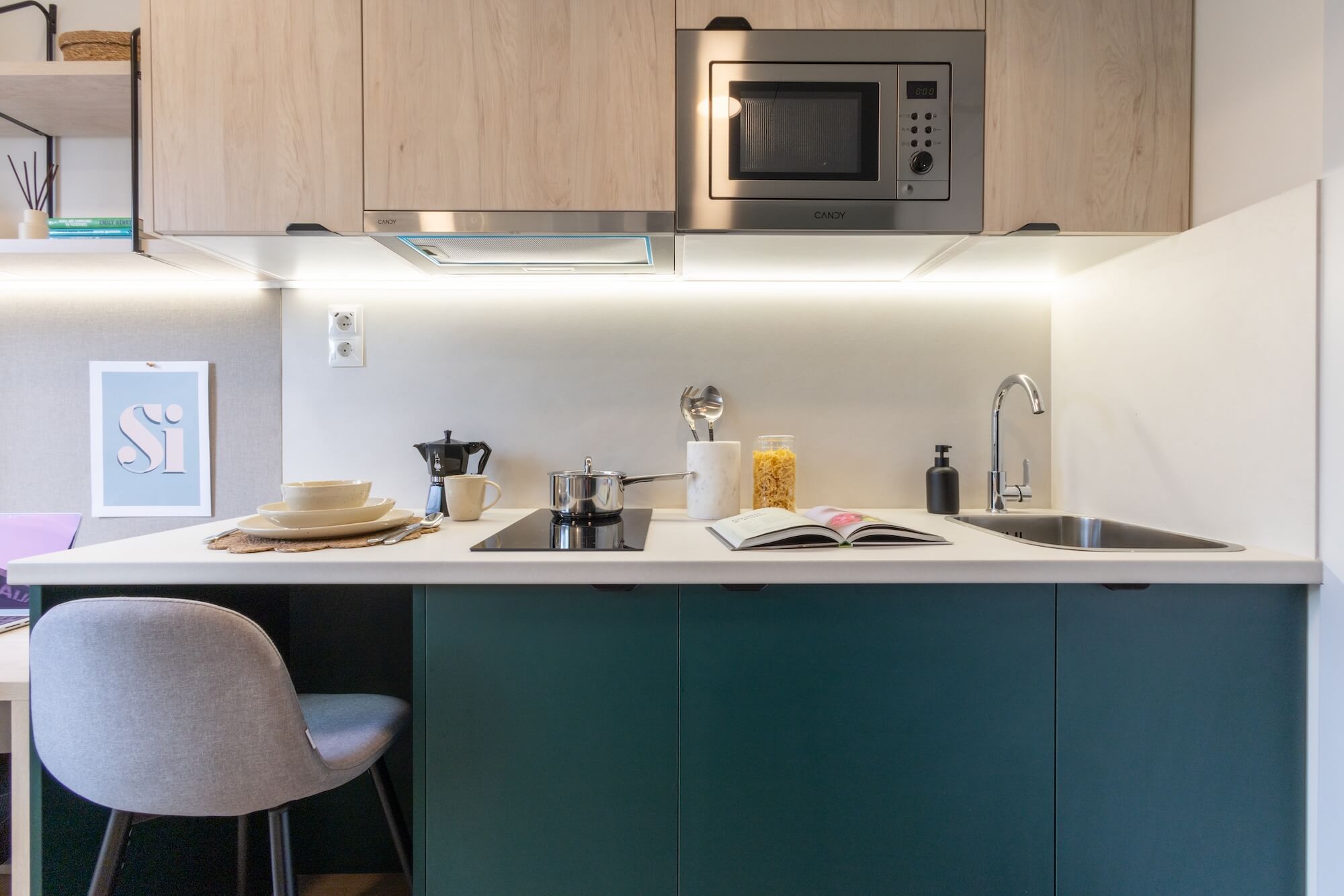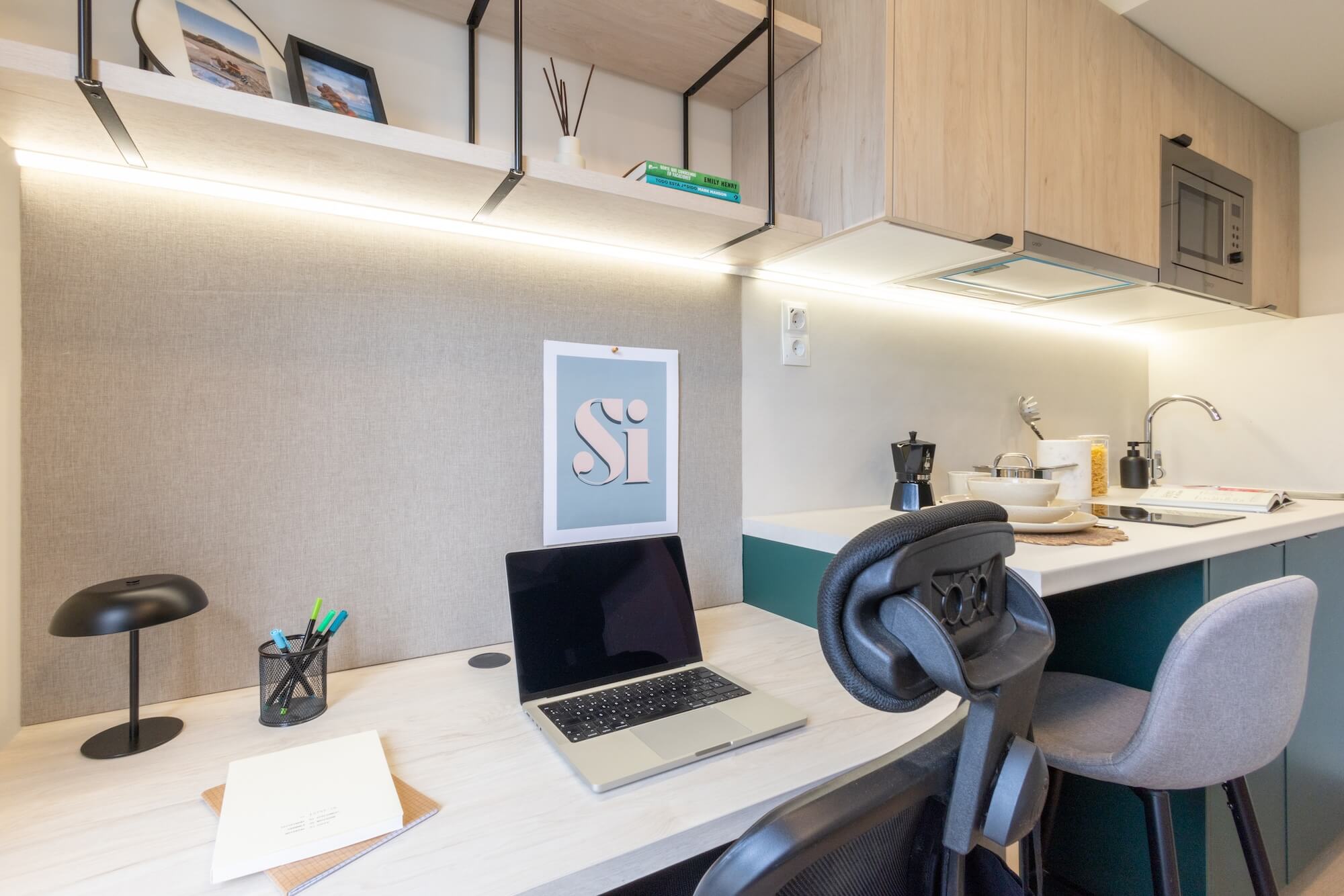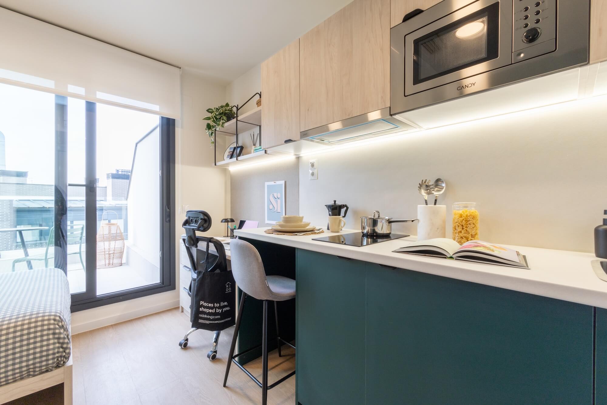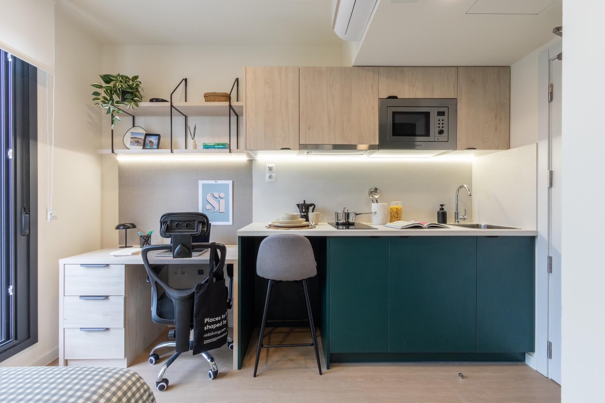 Disfruta del beneficio adicional de espacio exterior con nuestro Classic Studio con terraza, ubicado en los pisos 0 y 4. Estos estudios varían entre 13 y 14m² en el interior, con terrazas de entre 7 y 11m², perfectas para tomar aire fresco. En el interior, encontrarás una cocina con placa de inducción de 2 fuegos, campana extractora, fregadero, nevera con estante congelador y horno-microondas. Estos estudios incluyen una cómoda cama de 120 cm, smart TV, amplio armario, mesa de estudio con luz de trabajo LED y silla de oficina, además de tu propio baño privado.