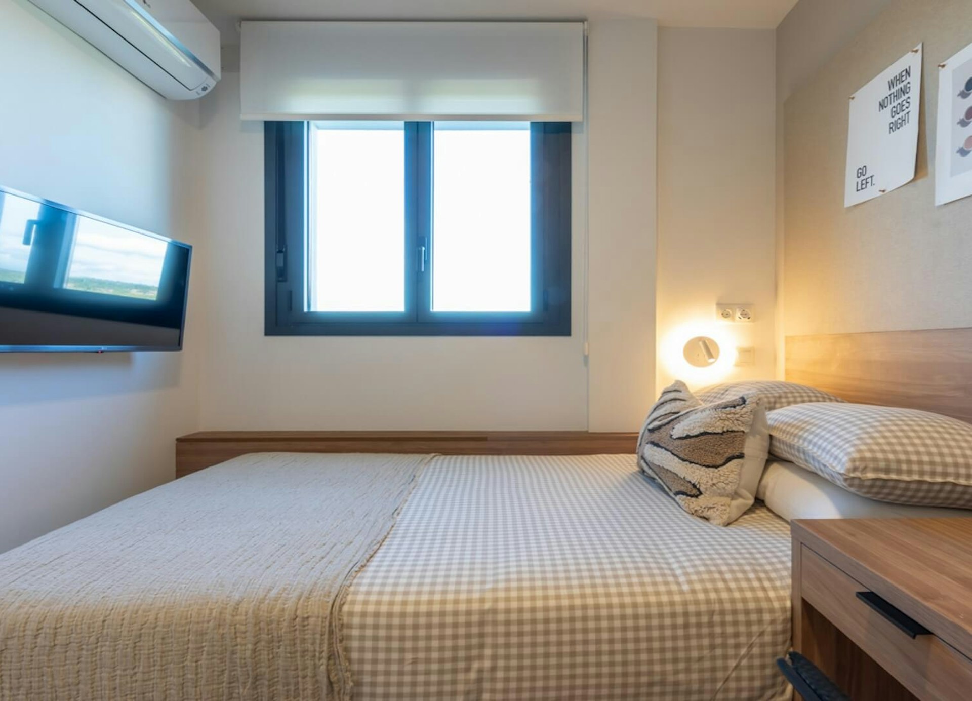 Cada habitación cuenta con una cama doble compacta 120cm, escritorio y silla de estudio, armario con estantes, espejo de cuerpo entero y un baño en suite. El espacio compartido incluye una barra de desayuno y taburetes, una pequeña cocina con nevera, fregadero, placa de cocina, microondas-horno y mucho espacio de almacenamiento, además de un cómodo sofá y TV de pantalla plana. No olvidemos la amplia terraza, perfecta para descansos de estudio y reuniones.