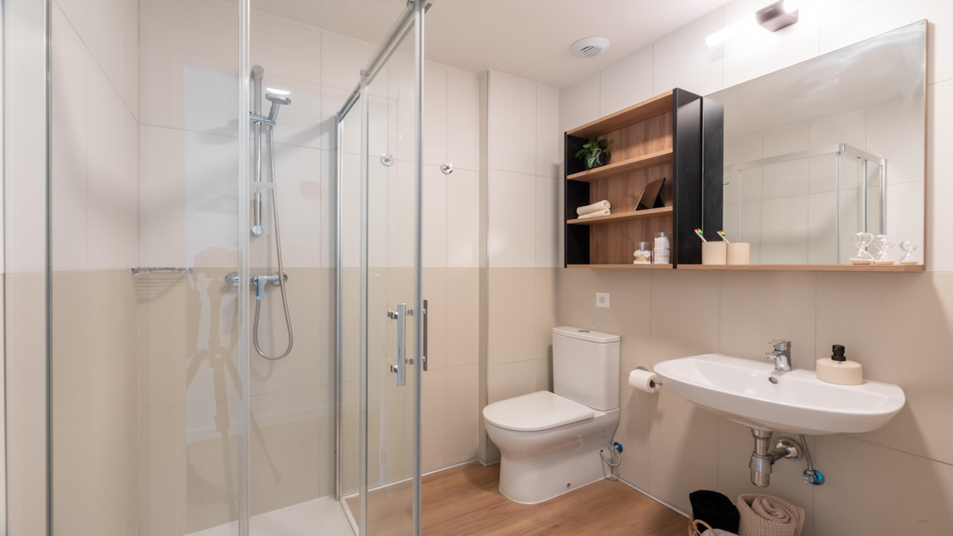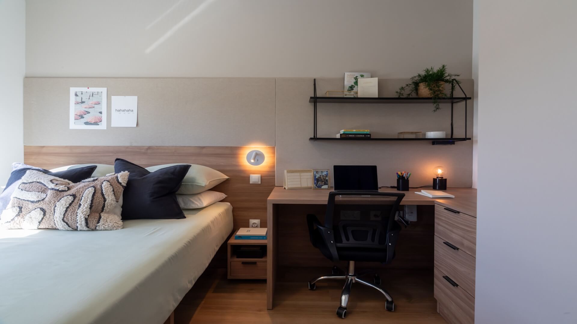 Nuestras habitaciones Classic en un apartamento de 3 habitaciones miden 15-19 m2 y se encuentran en los pisos 1 al 7 y son ideales para compartir con amigos. Están diseñadas para que tengas la privacidad de tu propio dormitorio y baño privado, mientras aún disfrutas del ambiente acogedor de una sala de estar y cocina compartidas con otras 2 personas.