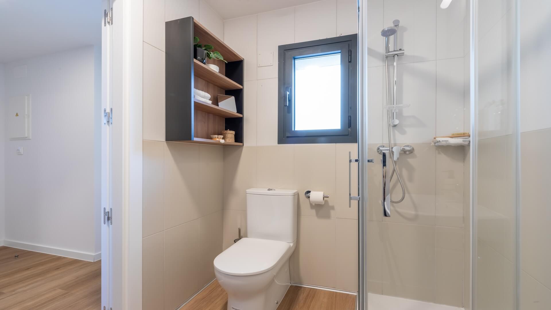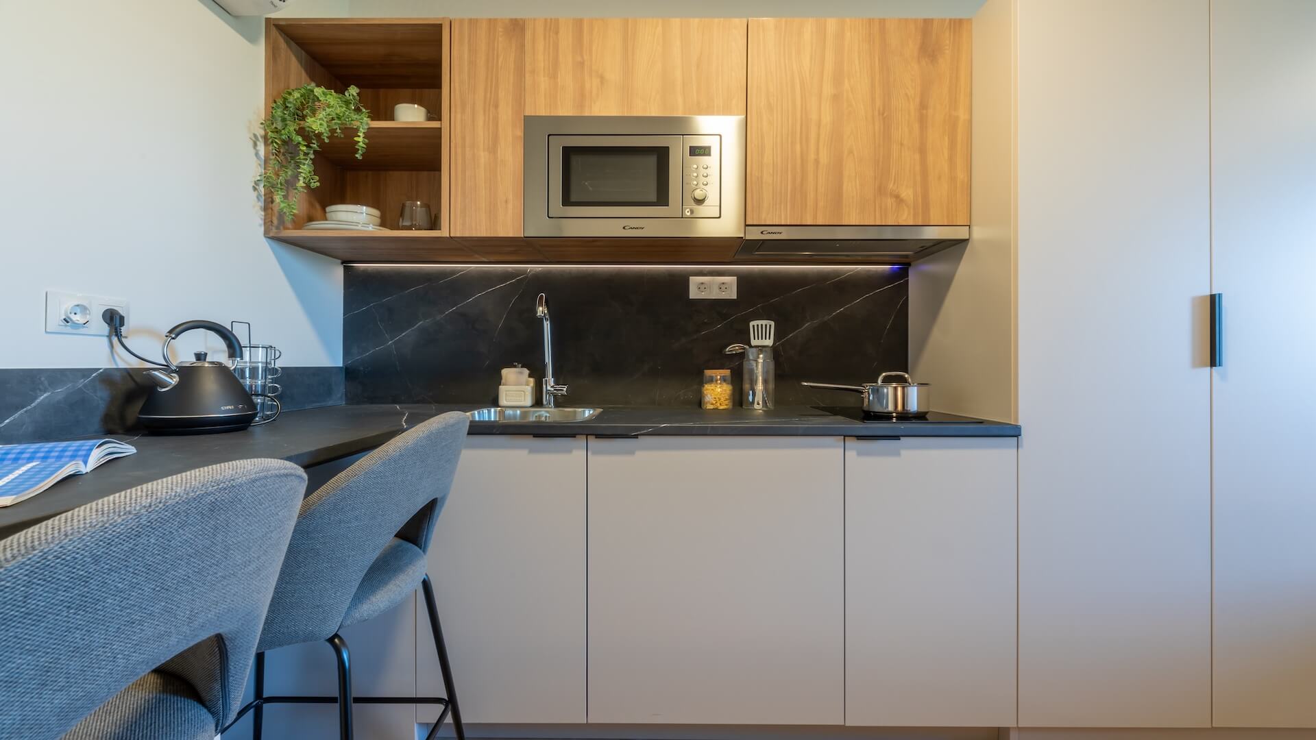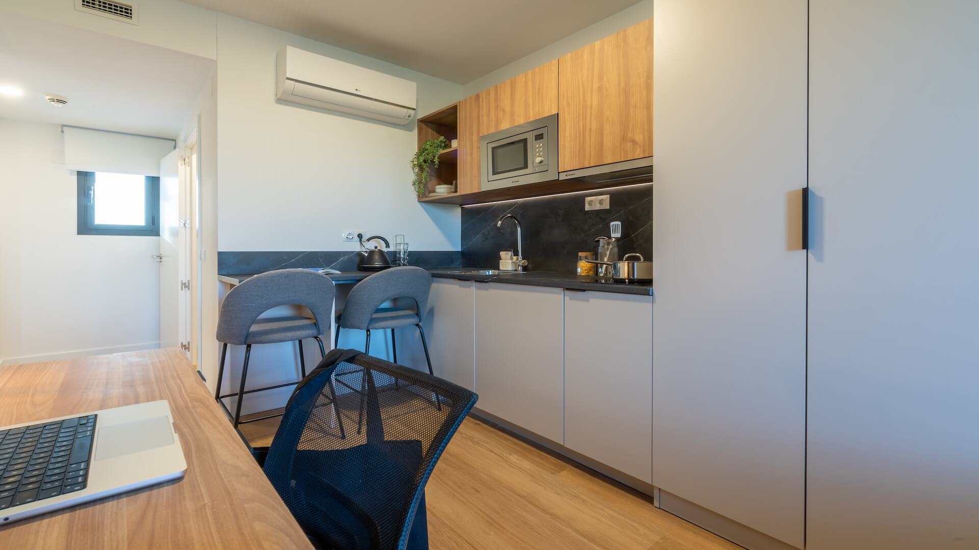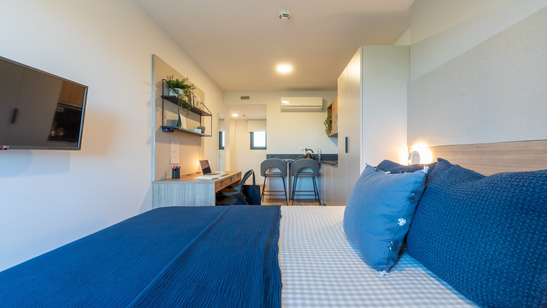 Cada apartamento estudio viene con una cama doble compacta de 150cm, escritorio y silla de estudio, armario con estanterías, espejo de cuerpo entero, baño ensuite y una cocina pequeña con almacenamiento, placa de inducción, horno microondas combinado, nevera y barra de desayuno con taburete.