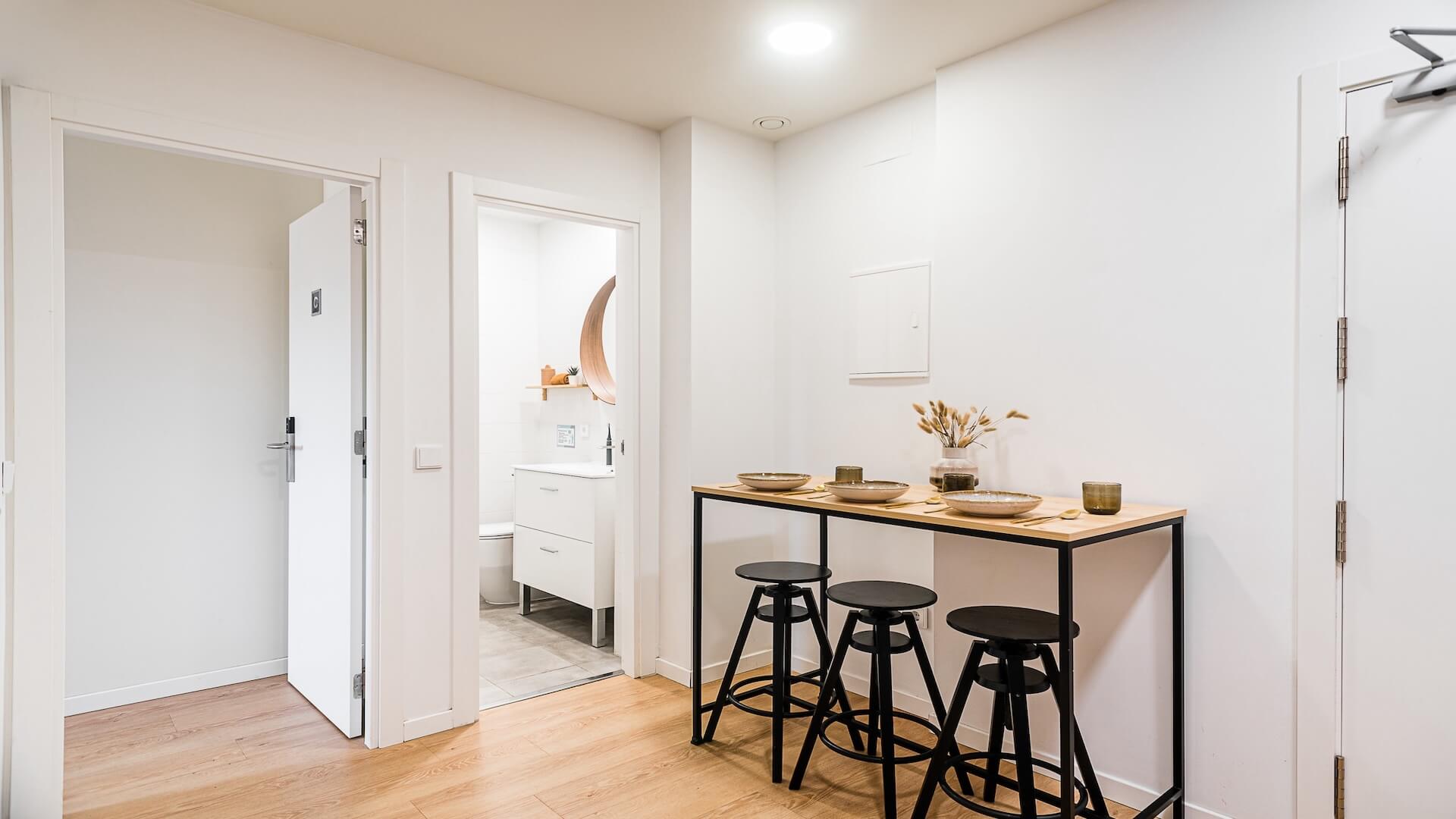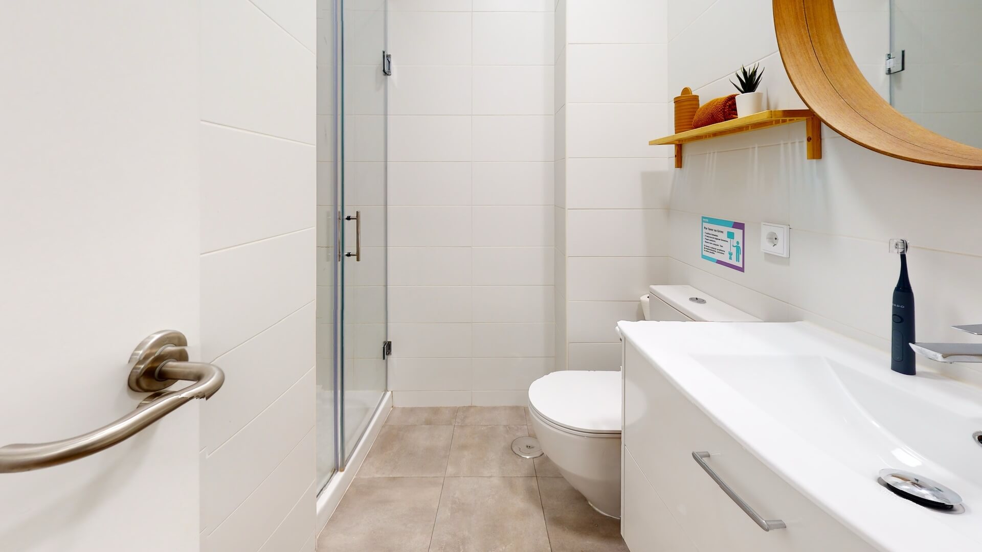 Nuestras Habitaciones Classic en un Apartamento de 3 Habitaciones, con un tamaño entre 9 y 11 m², están disponibles en todas las plantas. Cada habitación incluye una cómoda cama de 90cm, un armario espacioso y un escritorio con silla de oficina para garantizar tu máxima comodidad. También tendrás un baño y una cocina compartidos, equipados con fregadero, placa de 2 fuegos, nevera con congelador, microondas y una barra de desayuno con taburetes, para que preparar y compartir comidas sea fácil y práctico.