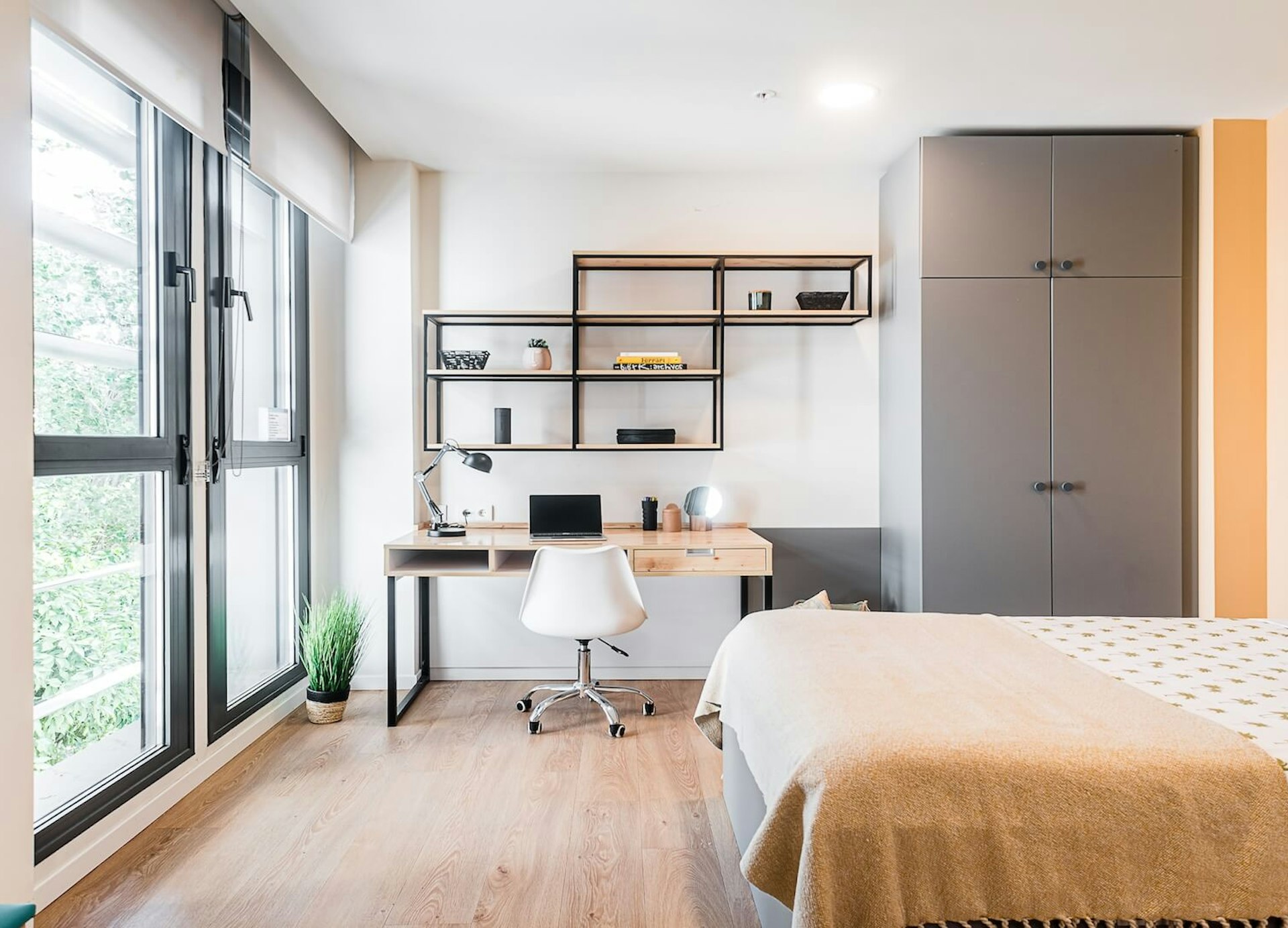 Nuestros Classic Studios, ubicados en las plantas 0, 1, 2 y 3, ofrecen 26 m² de espacio habitable, diseñados pensando en tu comodidad. Cada estudio incluye una kitchenette con una placa de inducción de 2 fuegos, campana extractora, fregadero, frigorífico con congelador, y microondas. También contarás con una barra de desayuno con taburete, una cómoda cama de 120 cm, un amplio armario, un escritorio con silla de oficina y lámpara de escritorio, además de un amplio baño en suite accesible.