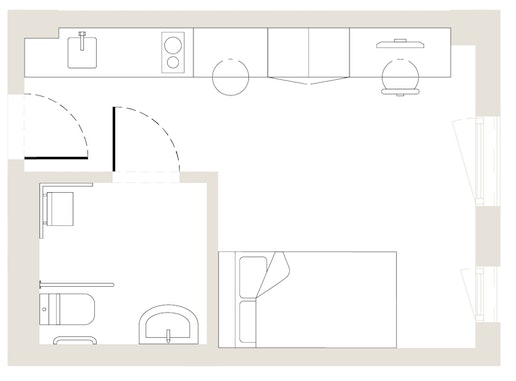 Nuestros Classic Studio (Accesible) tienen 20-22m2 y están situados en la planta baja, primera, segunda, tercera y cuarta planta. Cada estudio tiene una cama doble compacta, escritorio y silla de estudio, armario con estantes, espejo de cuerpo entero, baño privado y una pequeña cocina con espacio de almacenamiento, placa de inducción, microondas y nevera. Son habitaciones accesibles y espaciosas, con baños grandes y adaptados para sillas de ruedas.