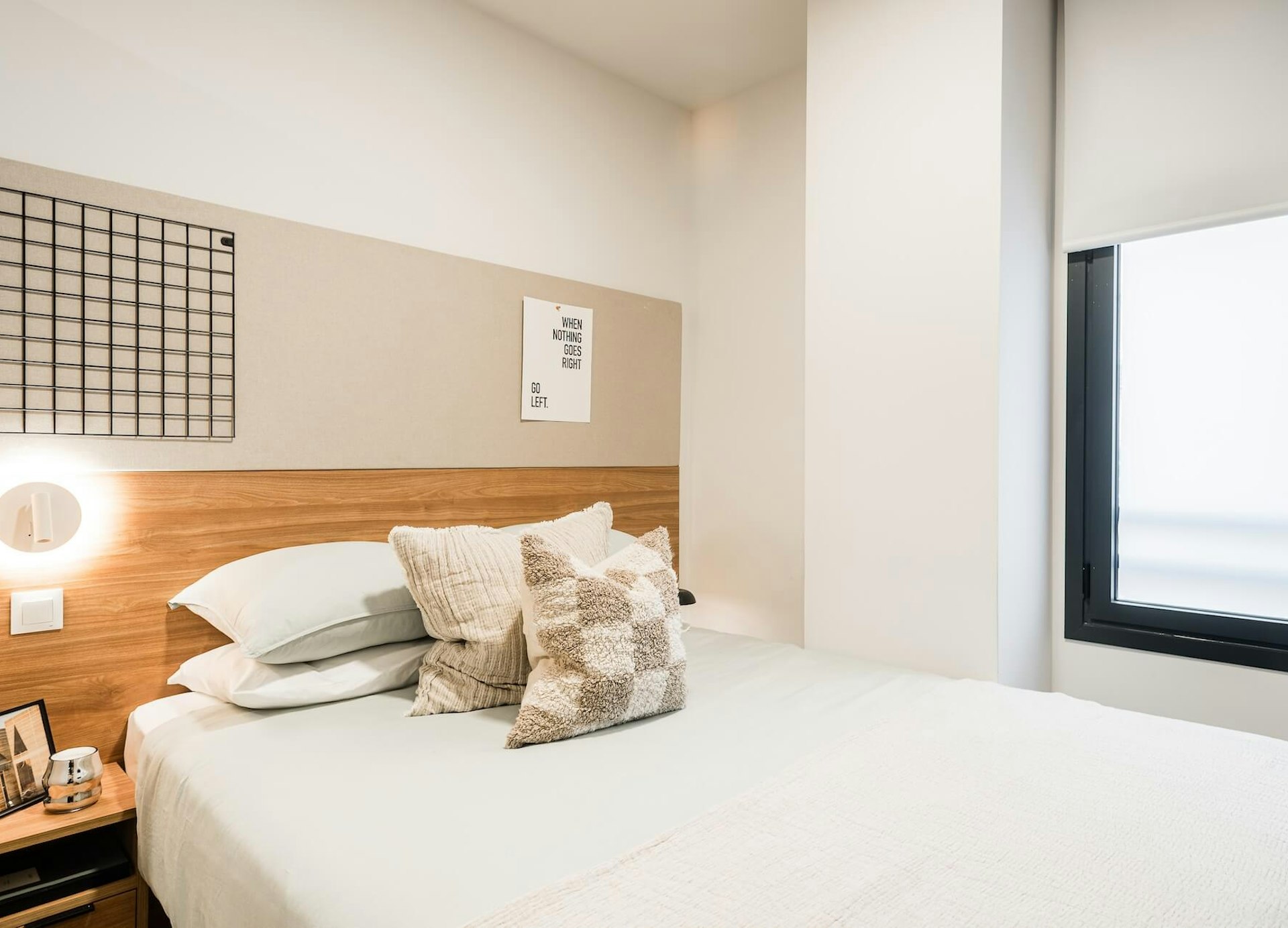 Nuestros Classic Studios (Accesible) tienen entre 20-21 m2 y se encuentran ubicados en los pisos 1 al 11. Cada estudio cuenta con una cama doble compacta de 120 – 150cm, escritorio y silla de estudio, armario con estanterías, espejo de cuerpo entero, baño privado y una pequeña cocina con almacenamiento, placa de inducción, horno microondas combinado, nevera y barra de desayuno con taburete.