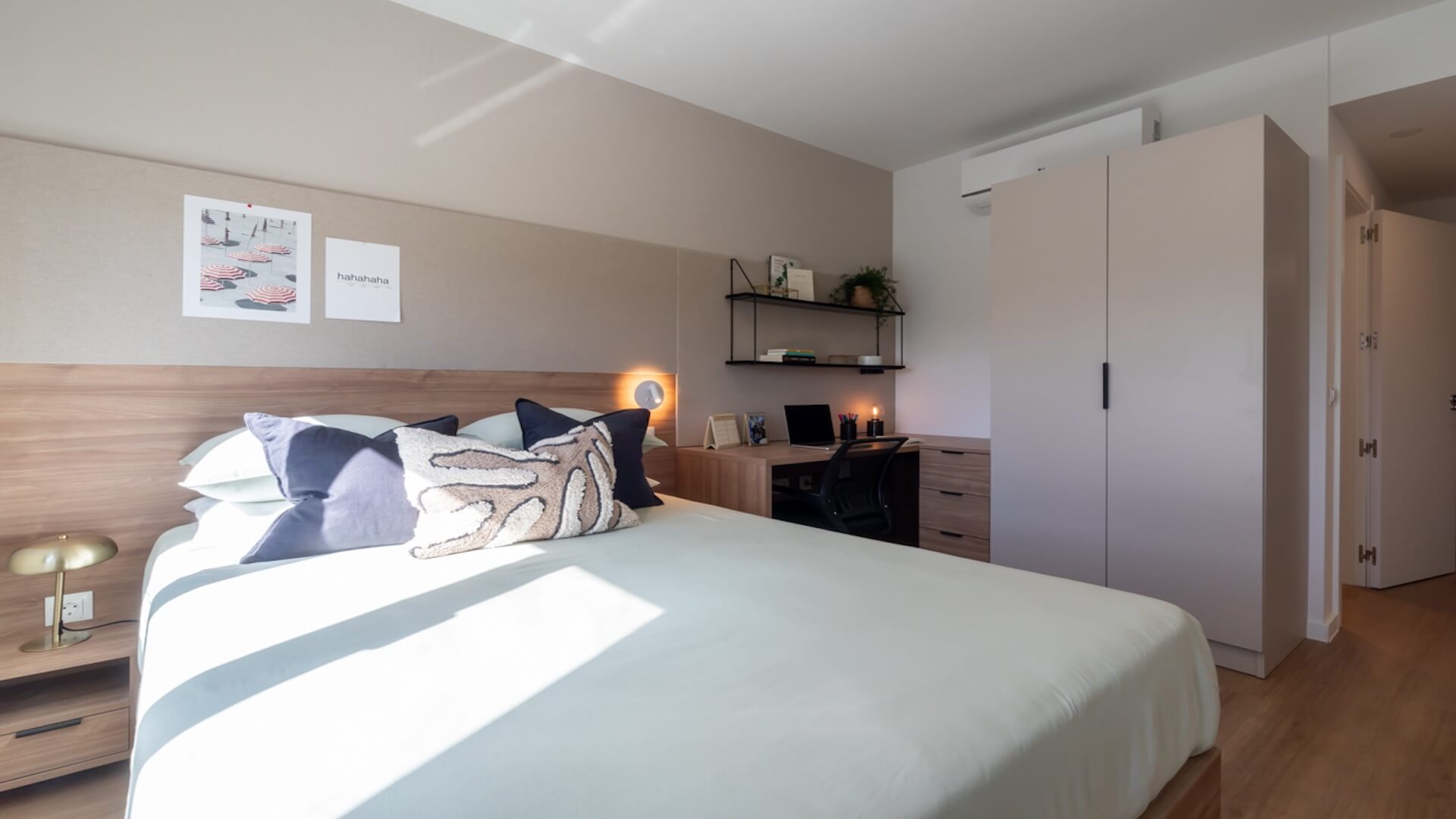 Each room comes with a compact 105-135cm double bed, study desk & chair, wardrobe with shelving, full length mirror, and an ensuite bathroom. The shared living space includes a fully equipped kitchen including a fridge-freezer, sink, hob, microwave, oven and plenty of storage, plus a dining table and chairs, comfy sofas and a flatscreen TV. You can still use all of our common spaces & attend our events so making friends won’t be a problem – you get the best of both worlds.