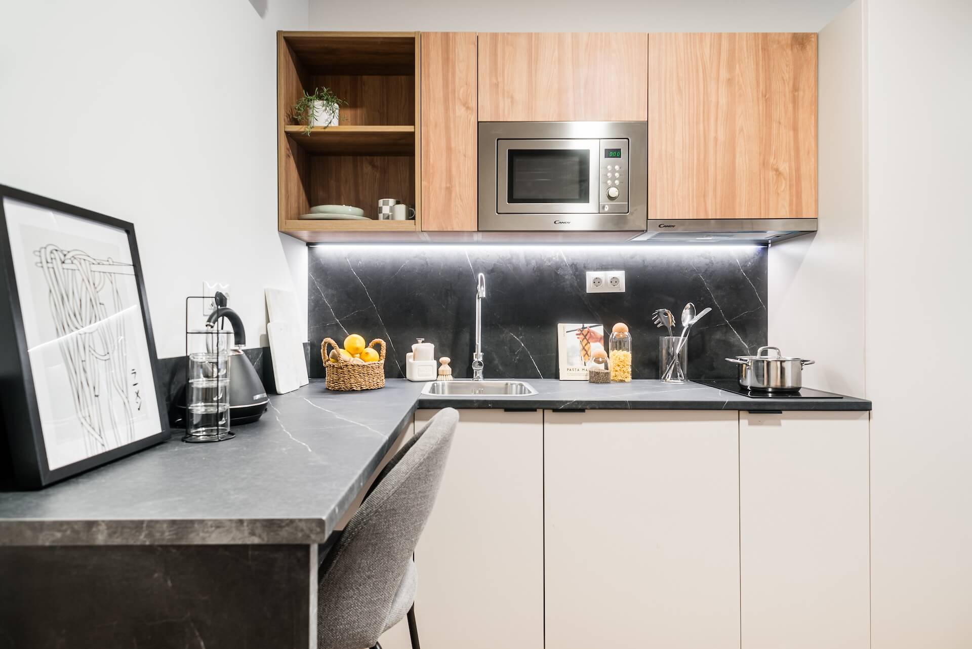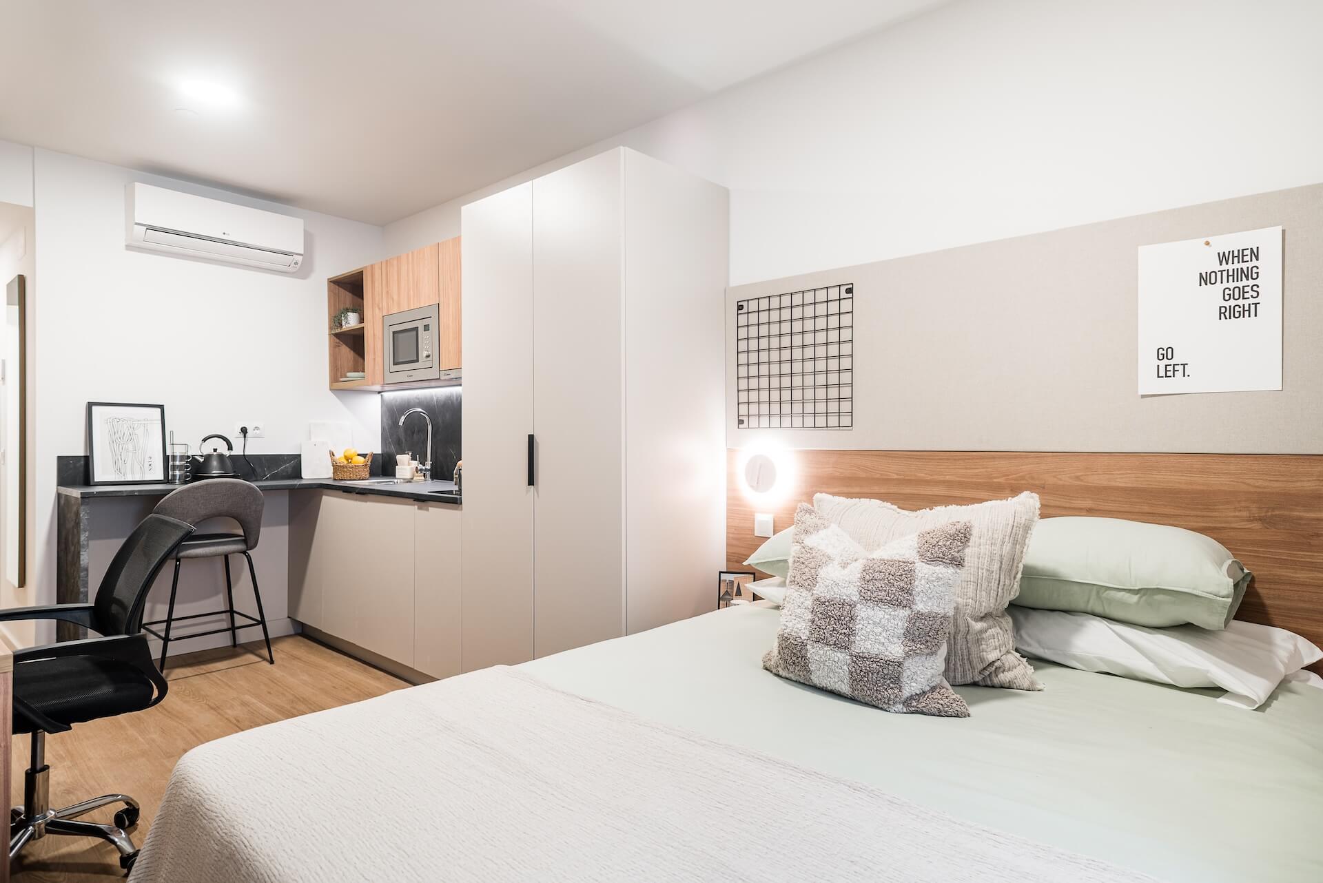 Our Classic Studios (Accessible) are 20.0-21.6 m2 and are located on floors 1 to 11. Each studio apartment comes with a 120 – 150cm compact double bed, study desk & chair, wardrobe with shelving, full length mirror, ensuite bathroom and a kitchenette with storage, induction hob, combi microwave oven, fridge and breakfast bar with stool.