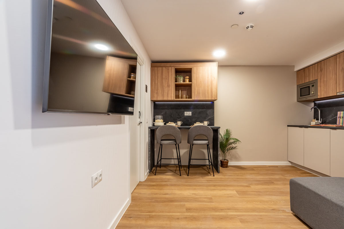 Each room comes with a 105-135cm compact double bed, study desk & chair, wardrobe with shelving, full length mirror, and an ensuite bathroom. The shared living space includes a dining table and chairs, small kitchenette with a fridge, sink, hob, combi microwave-oven and plenty of storage, plus a comfy sofa and flatscreen TV. You can still use all of our common spaces & attend our events so making friends won’t be a problem – you get the best of both worlds.